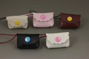 ②革製品を作る際に残った様々な種類の端革を活用した、髪飾り、帯留めなどのつまみ細工。(ECOにもつながる)